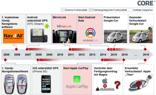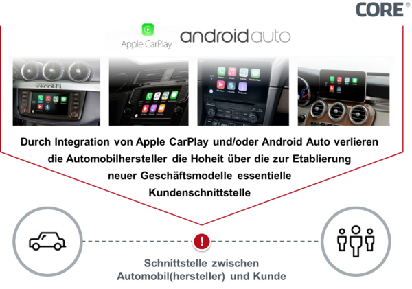 Neben den Automobilherstellern und deren Kooperationspartnern selbst, versuchen neue Marktteilnehmer – und auch hier insbesondere Technologieanbieter, wie Apple mit CarPlay oder Google mit Android Auto – das Fahrzeug als Kundenschnittstelle für bestehende und neue Geschäftsmodelle zu utilisieren und platzieren ihre Angebote dabei bewusst zwischen den Automobilherstellern und deren Kunden.